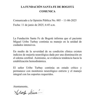 “En medio de la severidad de su condición clínica existen indicios de mejoría neurológica dada por una disminución en el edema cerebral. Asimismo, se evidencia tendencia hacia la estabilización hemodinámica”, indica un comunicado del centro médico, Fundación Santa Fe de Bogotá.