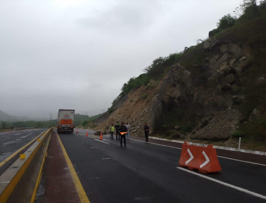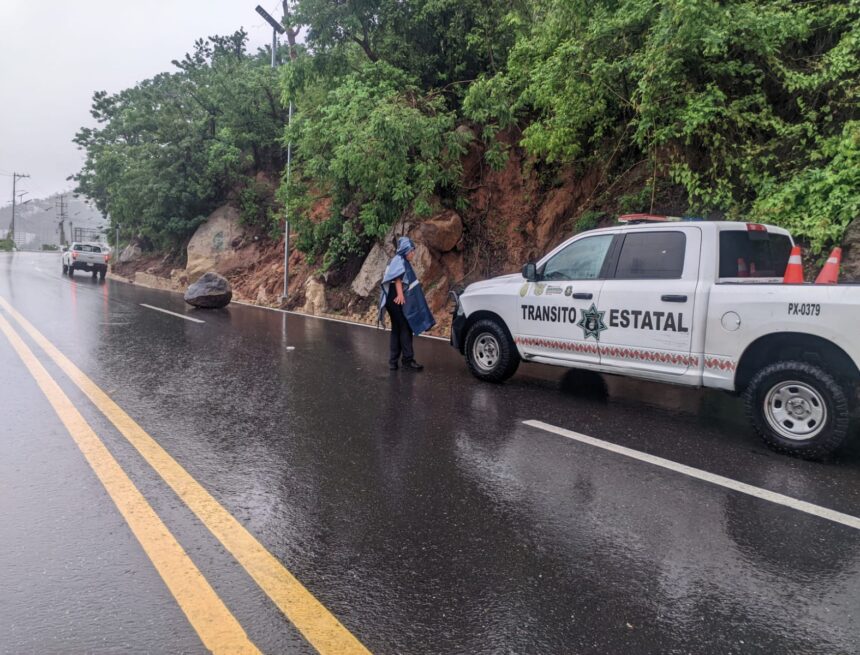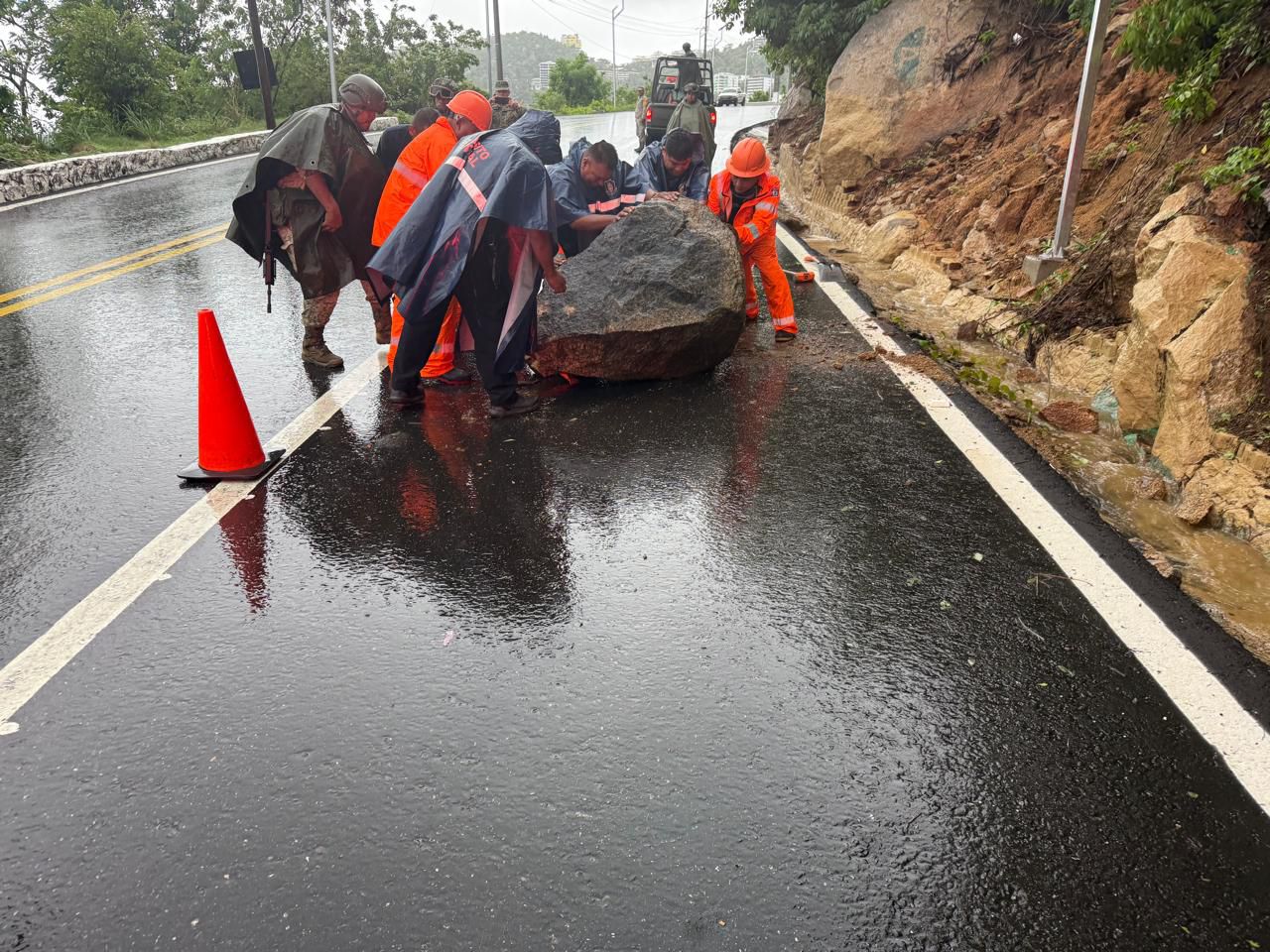 En una labor conjunta, elementos de la Secretaría de Gestión Integral de Riesgos y Protección Civil, junto con personal de la Secretaría de Seguridad Pública estatal, mantienen presencia en Acapulco, particularmente en la Avenida Escénica, donde brindan apoyo vial a automovilistas debido a la caída de rocas y lodo provocados por deslaves.
