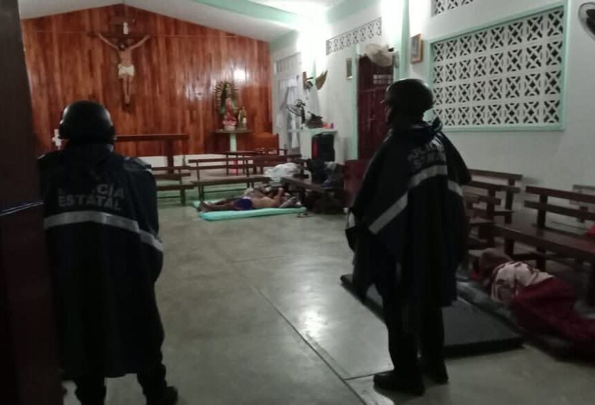 En el municipio de Coyuca de Benítez, la Policía Estatal resguarda el refugio temporal habilitado desde la noche del viernes en la iglesia de la comunidad de Venustiano Carranza, brindando seguridad a las familias que se trasladaron al lugar.