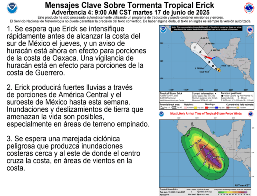 El Centro Nacional de Huracanes de Estados Unidos, con el cual colabora el Sistema Metereologico Nacional de México, informa que la tormenta tropical Erick podría intensificarse rápidamente antes de alcanzar las costas mexicanas del sur antes del día jueves. No obstante, exista ya un aviso previos de huracán en las costas de Oaxaca, cuyos efectos podrían alcanzar las costas de Guerrero.