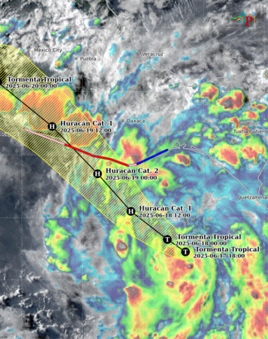 El SMN mantiene zona de prevención por efectos de huracán desde Puerto Ángel, Oaxaca, hasta Punta Maldonado, Guerrero, y zona de vigilancia por efectos de huracán desde el oeste de Punta Maldonado hasta Acapulco, Guerrero,