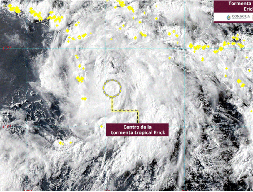 De acuerdo con el reporte del Servicio Metereológico Nacional (SMN) de las 18:30 horas, se advirte que «la tormenta tropical Erick continúa fortaleciéndose y se desplaza hacia el noroeste» y que «su amplia circulación ocasionará lluvias puntuales intensas, fuertes rachas de viento y oleaje elevado en Chiapas, Oaxaca y Guerrero». Es decir, durante las próximas horas, la circulación y los desprendimientos nubosos de la tormenta ocasionarán lluvias intensas en los estados de Guerrero, Oaxaca, Chiapas, y el sur de Veracruz, así como viento de 30 a 50 kilómetros por hora, con rachas de 60 a 80 kilómetros por hora, en las costas de Oaxaca y Chiapas; y de 10 a 20 kilómetros por hora, con rachas de 30 a 50 kilómetros por hora, en el litoral de Guerrero.