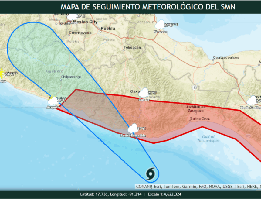 Debido a sus desprendimientos nubosos, se esperan lluvias extraordinarias en Oaxaca y torrenciales en Guerrero y Chiapas, con rachas de viento de 150 a 170 kilómetros  por hora y oleaje de 5.0 a 6.0 metros de altura en costas de Oaxaca y Guerrero,