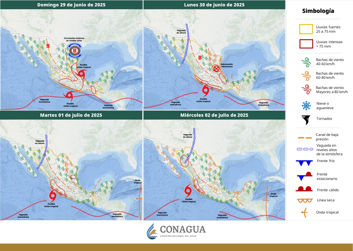 Las bandas nubosas del sistema, en combinación con el arrastre de humedad que genera, ocasionarán lluvias torrenciales en Oaxaca e intensas en Guerrero y Michoacán, y oleaje de 3 a 4 metros en costas de Guerrero y Oaxaca.