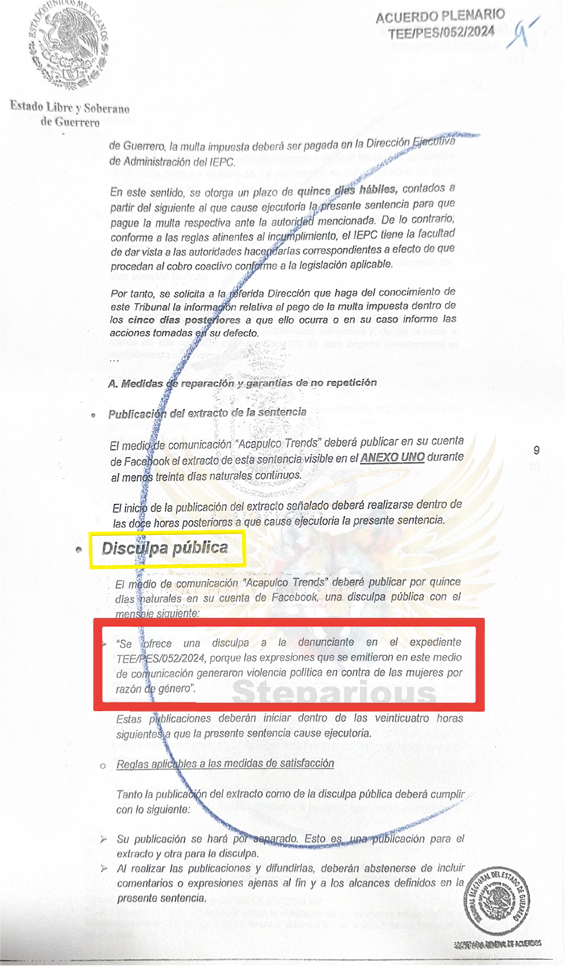 * En el expediente TEE/PES052/2024, el TEEGro impuso, además de una sanción económica de «22 mil 628 pesos», una orden a «JCGA» (propietario de dichas comunidades informativas) ofrecer disculpas públicas «durante 15 días» a la alcaldesa de Acapulco, con el siguiente texto que el mismo TEEGro redactó: