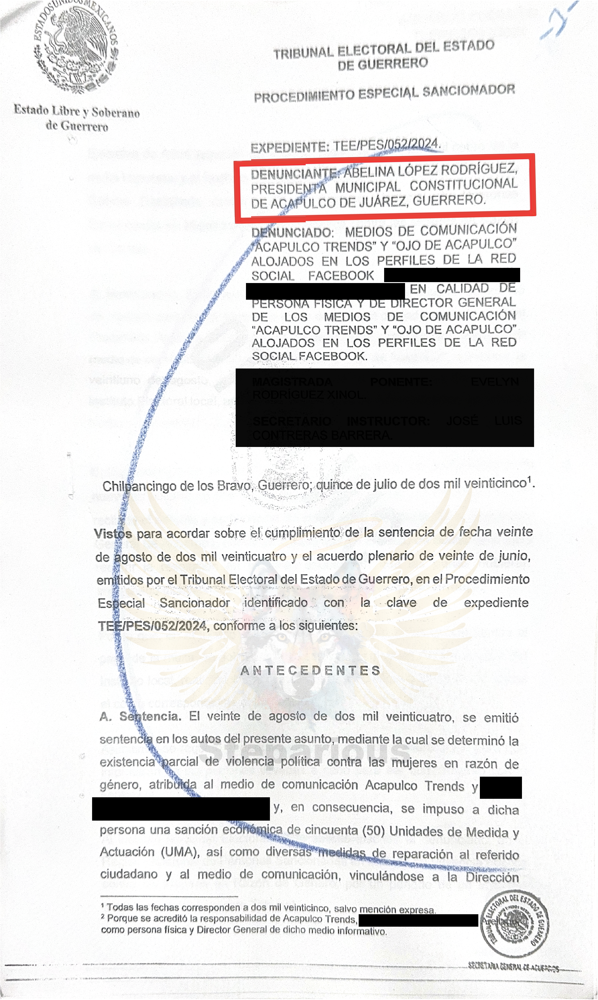 En lo que viene siendo la primera denuncia de la alcaldesa de Acapulco, Abelina López Rodríguez, contra un director de dos páginas informativas de Facebook, el Tribunal Electoral del Estado de Guerrero (TEEGro) sancionó por «Violencia Política en razón de género» al editor y director de las páginas de Facebook Acapulco Trends y El Ojo de Acapulco. El propietario de dichas páginas (…) atribuye la queja, sin embargo, a las denuncias que han estado realizando contra el gobierno municipal y el tema de los 898 millones de pesos que la alcaldesa se niega a transparentar ante la Auditoría Superior del Estado, argumentando incompentencia de esta dependencia para realizar dicha acción fiscal.