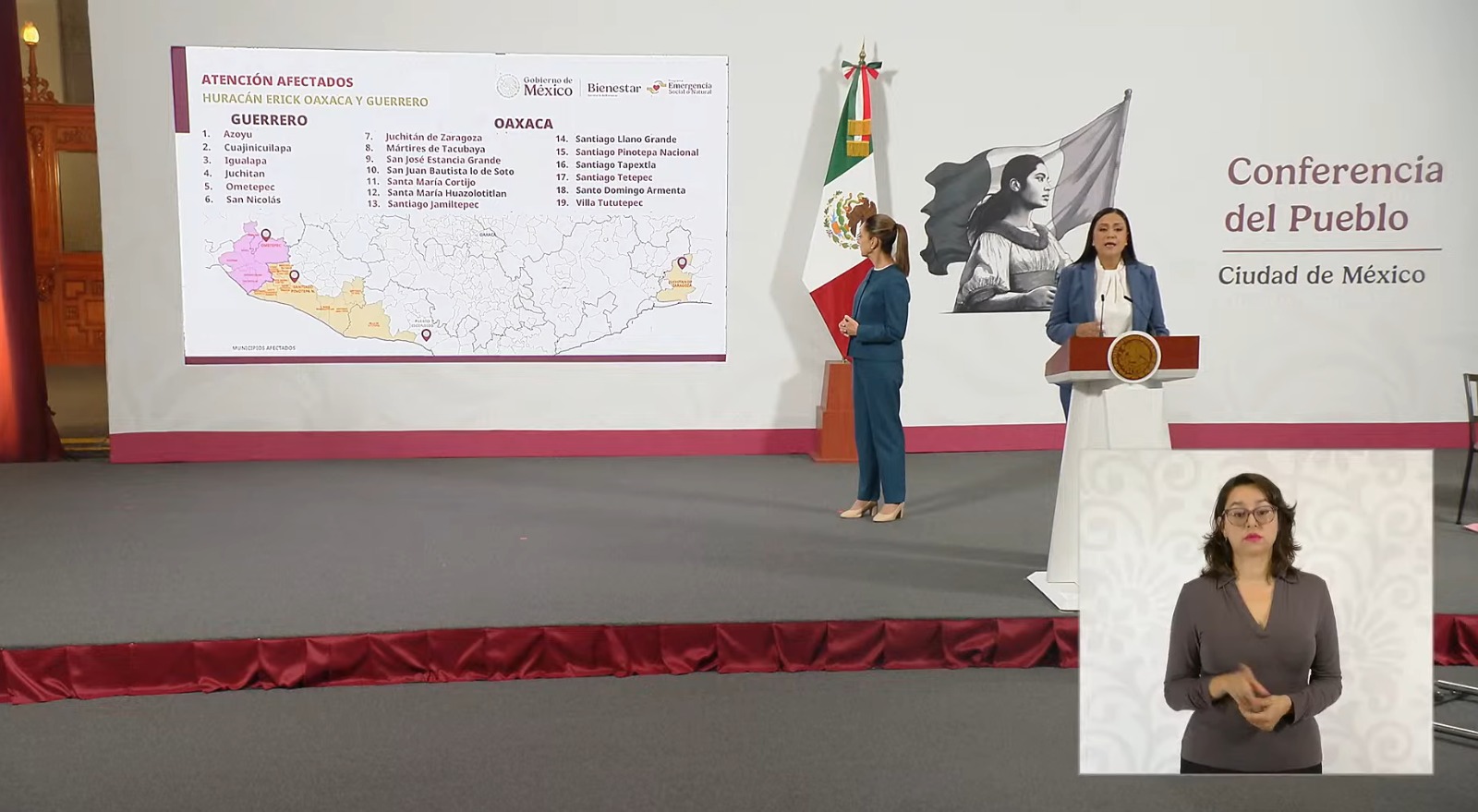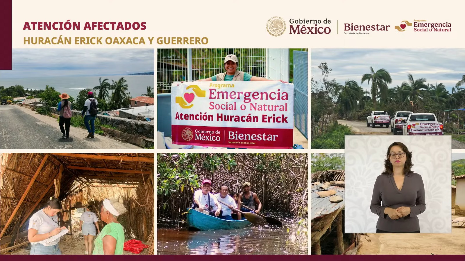 informó que se atendieron a un total de 59 mil 519 familias afectadas por el huracán Erick en los estados de Guerrero y Oaxaca, donde se brindó atención prioritaria a las zonas más dañadas por el fenómeno natural.
