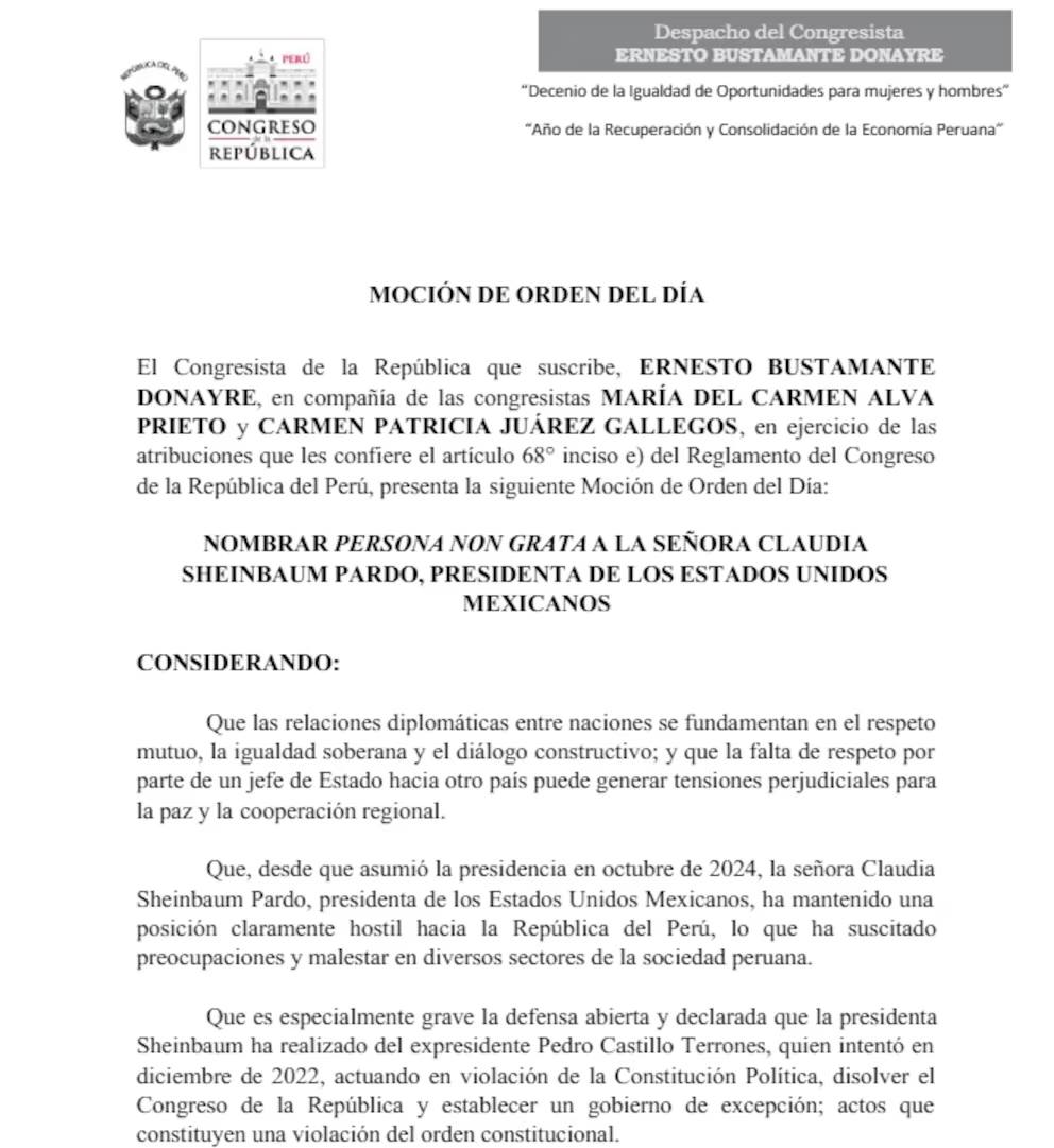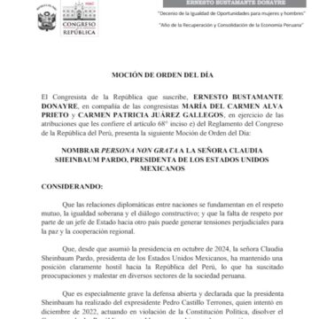 La moción decidió declarar persona no grata a Sheinbaum, en rechazo a sus declaraciones, interpretadas como una “inaceptable injerencia en asuntos internos del Perú y una ofensa al sistema democrático nacional”. Además, ordena oficiar al Ministerio de Relaciones Exteriores a que difunda la moción mediante los canales diplomáticos y tome las acciones correspondientes.