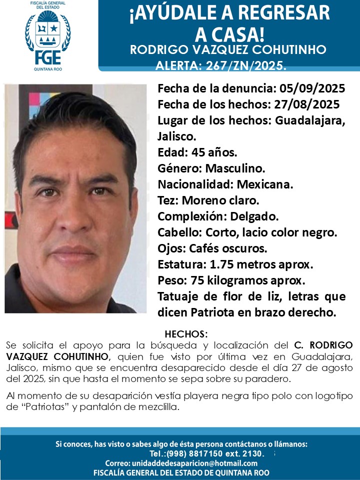 La Fiscalía de Quintana Roo emitió una ficha de búsqueda para localizar a Rodrigo Vázquez Coutiño, activista y exaspirante a la