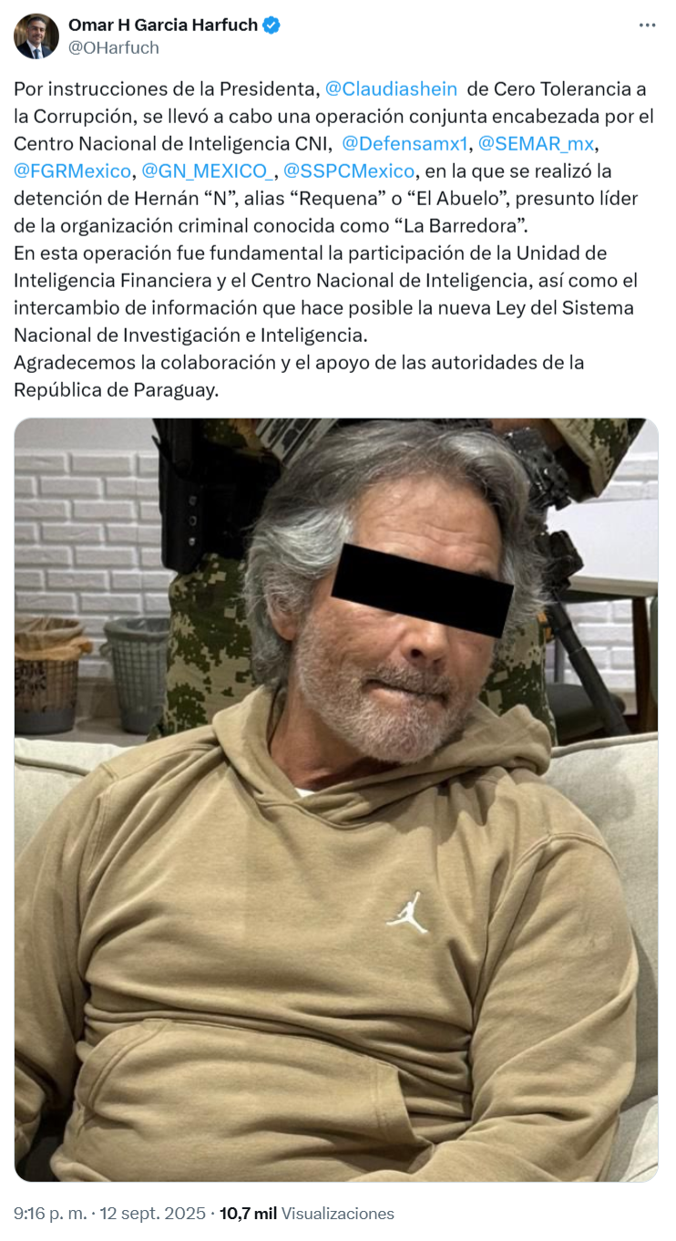 El titular de la Secretaría de Seguridad y Protección Ciudadana (SSPC), Omar García Harfuch, informó este viernes la detención de Hernán Bermúdez Requena, alias o “El Abuelo”, presunto líder de la organización criminal conocida como “La Barredora”.