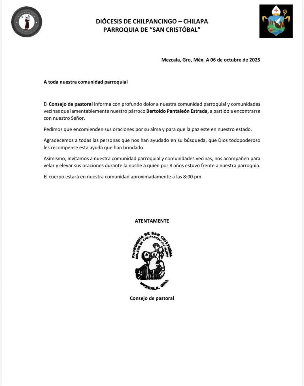 La Diócesis Chilpancingo-Chilapa, a través de un comunicado, agradeció a todas las personas que ayudaron en la búsqueda e invitó a los habitantes a acompañar a la velación del sacerdote en la parroquia donde ofició.