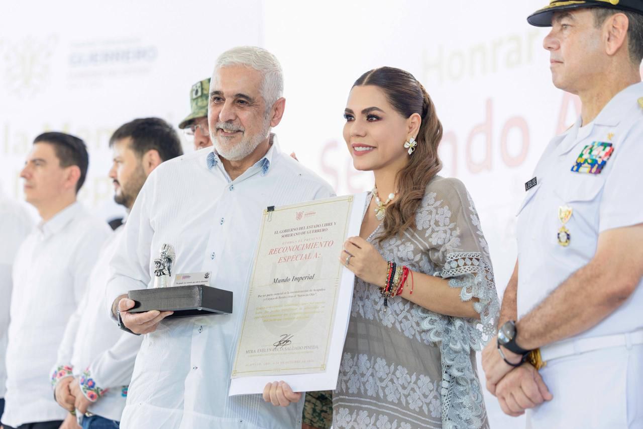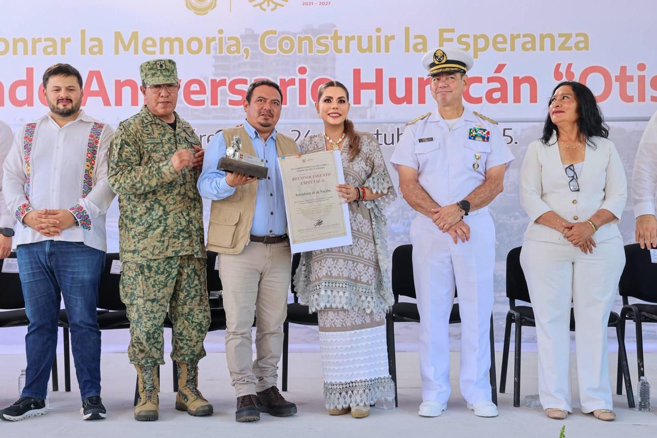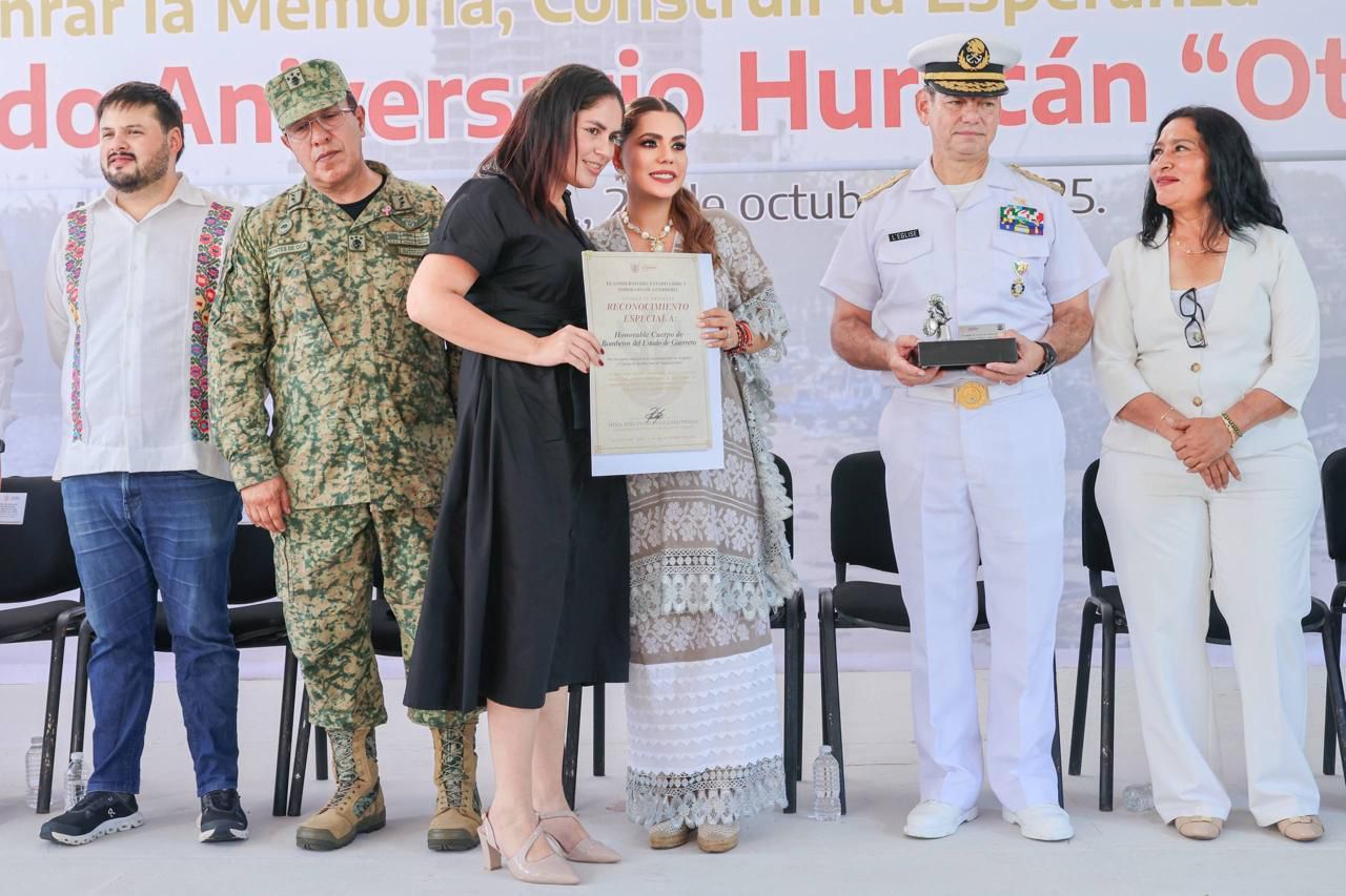 Enseguida, la gobernadora entregó reconocimientos a las personas e instituciones que participaron en las labores de apoyo y reconstrucción como son Cruz Roja, Comisión Federal de Electricidad, Estrella de Oro, World Central Kitchen, Teléfonos de México, Brigada Otis, A.C., Costaline, Mundo Imperial, Unicef México, Bomberos Acapulco, Comedores Comunitarios, Grupo Iusa, Universidad Autónoma de Guerrero, Parroquia de Costa Azul, Cuerpo de Bomberos del Estado de Guerrero, Secretaría de Marina, Secretaria de la Defensa Nacional, Servidores de la Nación, entre otros.