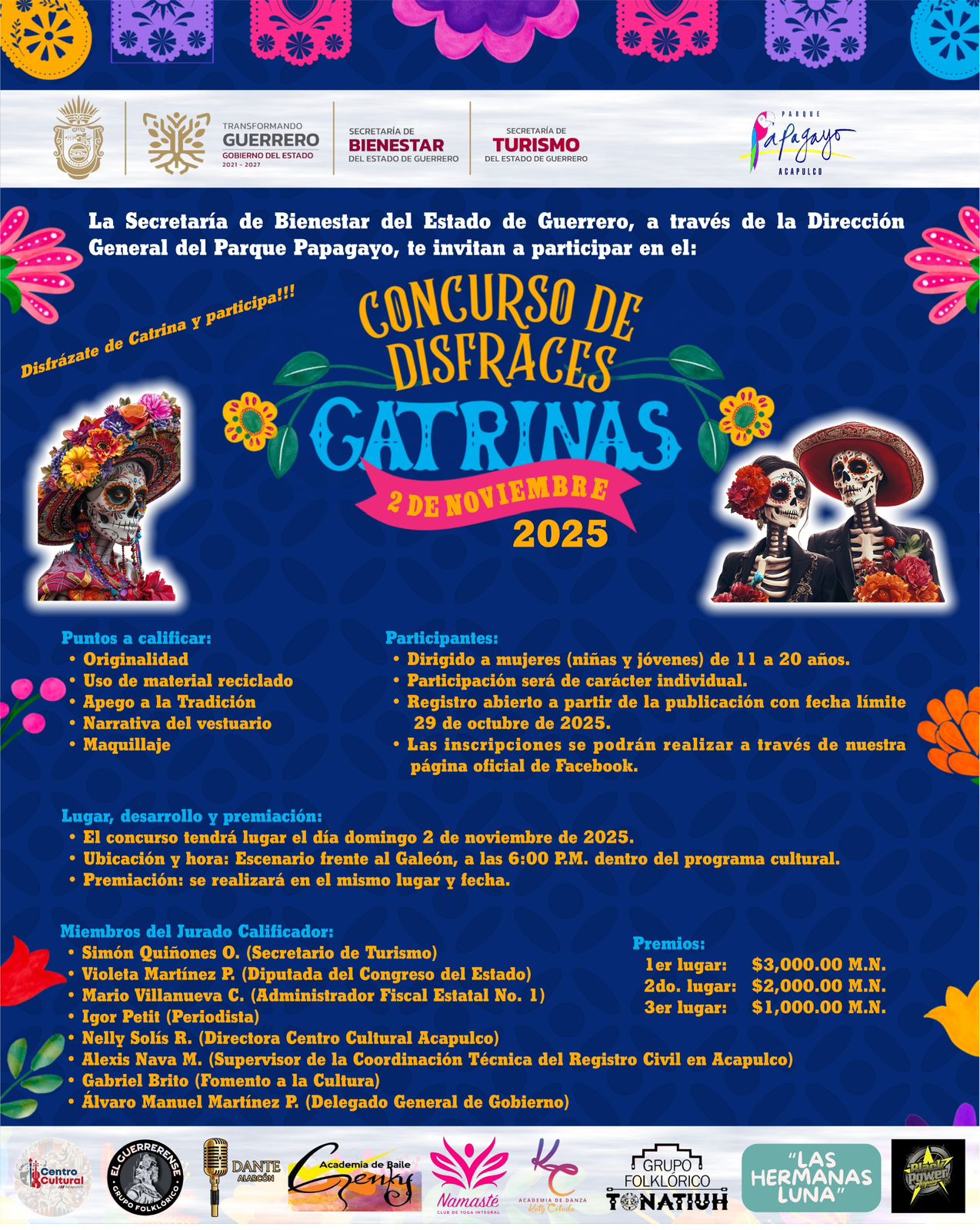 El funcionario remarcó que los criterios de evaluación de los participantes consisten, en el caso del concurso de catrinas: El apego a la tradición, usar material reciclado, originalidad, narrativa del vestuario y maquillaje; además mencionó que las inscripciones se están realizando a través de la página oficial de Facebook: Parque Papagayo Acapulco.