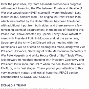 Horas atrás, la Casa Blanca explicó que se necesita más diálogo entre Ucrania y Rusia para lograr un acuerdo ya que todavía quedan «algunos detalles delicados» por resolver del plan de paz propuesto por Estados Unidos, aunque no son «insalvables».