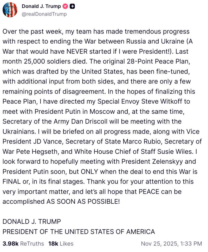 Con el objetivo de poner fin a este plan de paz, el jefe de Estado de Estados Unidos ordenó a su enviado especial Steve Witkoff que se reúna con Putin en Moscú y, al mismo tiempo, que el secretario del Ejército estadounidense, Dan Driscoll, se reúna con los ucranianos.