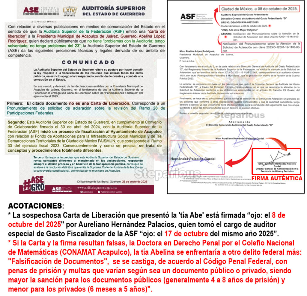 Aún cuando la Auditoría Superior Guerrero (ASG), precisa que respetará la resolución definitiva que emita la Suprema Corte de Justicia de la Nación (SCJN) en la controversia constitucional promovida por el Gobierno de Acapulco sí dejó muy claro mediante «precisiones técnicas y legales derivadas de su ámbito de competencia», que la supuesta «Carta de Liberación» emitida por Auditoría Superior de la Federación (ASF) a la alcaldesa por Morena en Acapulco, Abelina López Rodríguez, » no es una ‘carta de liberación’, sino «un Pronunciamiento de Solicitud de Aclaración» sobre la revisión del Ramo 28 de Participaciones Federales correspondientes al Ejercicio Fiscal 2023.