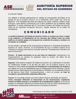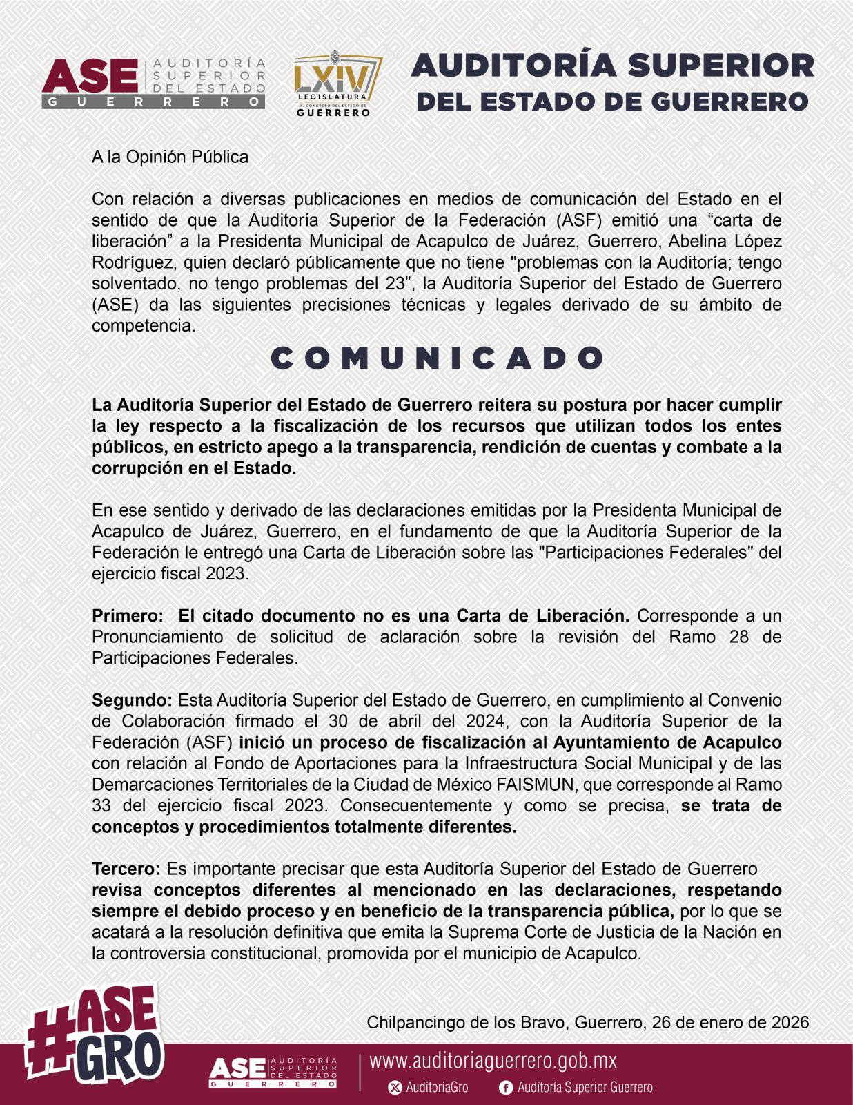 A través de un Comunicado dirigido este lunes, 26 de enero 2026, a la Opinión Pública desde su página oficial de Facebook, la ASG aclaró que aunque López Rodríguez declaró públicamente «no (tener) problemas con la Auditoría», relacionados con la rendición de cuentas de los recursos federales del Fondo de Aportaciones para la Infraestructura Social (FAIS) para «obras públicas y acciones sociales» en favor de Acapulco, Fondo de Aportaciones para la Infraestructura Social (FAIS), reiteró su «postura por hacer cumplir la ley respecto a la fiscalización de los recursos que utilizan todos los entes públicos, en estricto apego a la transparencia, rendición de cuentas y combate a la corrupción en el Estado».