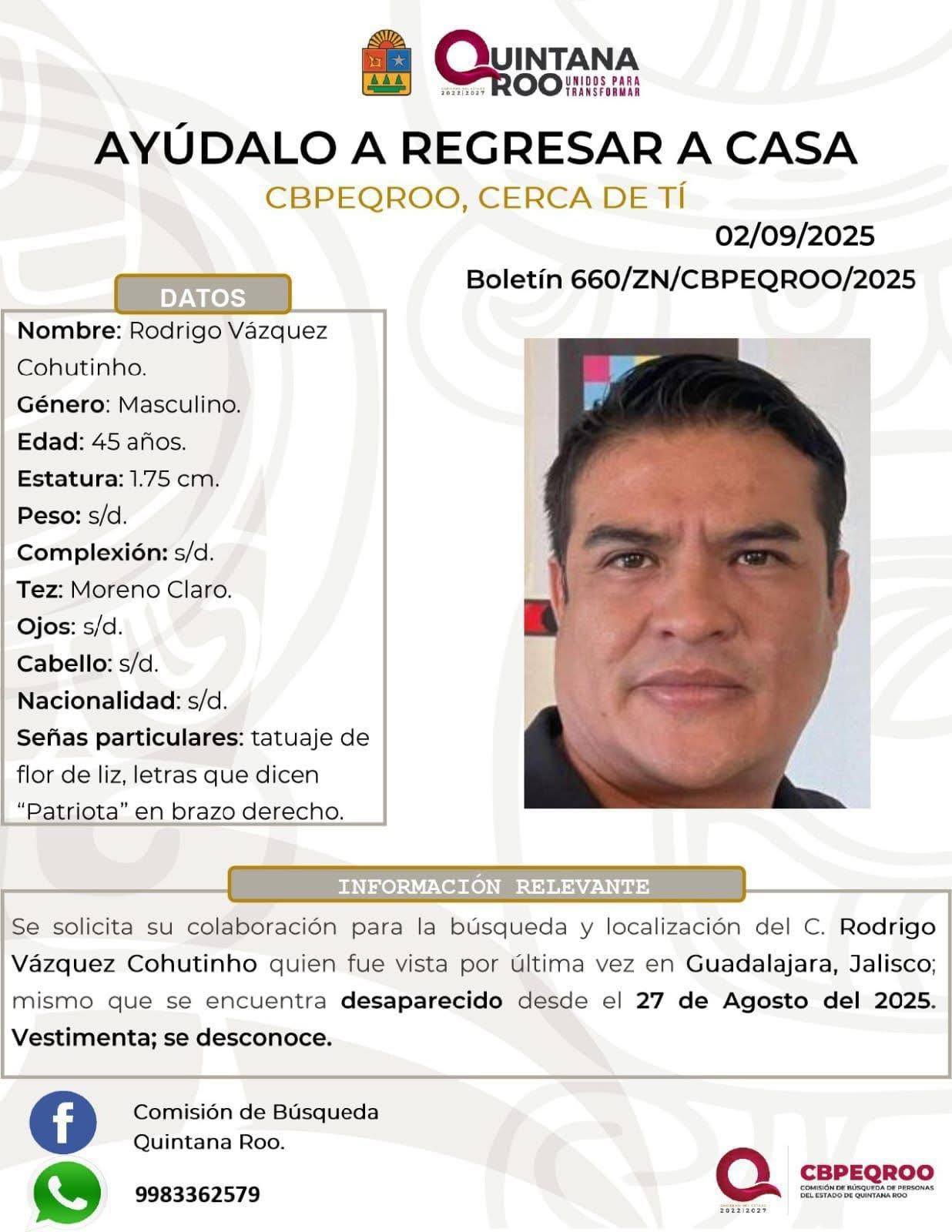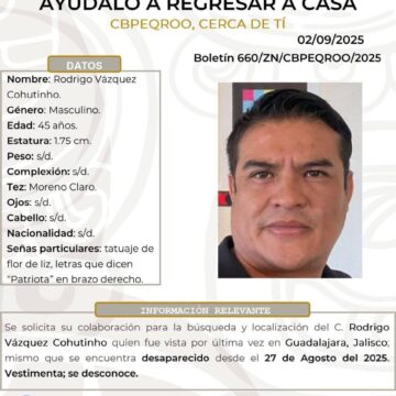 La Fiscalía de Quintana Roo emitió una ficha de búsqueda para localizar a Rodrigo Vázquez Coutiño, activista y exaspirante a la