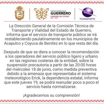 Tras la degradación del huracán Erick a depresión trocipal, la Comisión Técnica del Transporte y Vialidad del Estado de Guerrero informó esta tarde que el servicio de transporte público … Leer más